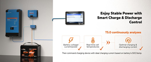 Through the Victron Remote Management (VRM) platform, users can monitor their complete power situation remotely without Bluetooth limitations and review historical energy data.