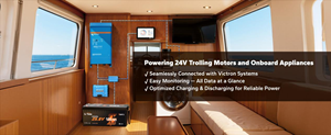 In marine applications, the 24V Smart ComFlex not only powers onboard living appliances but also provides steady propulsion for all 24V trolling motors, fully compatible with leading brands such as Minn Kota, Motorguide, Garmin Force, Lowrance Ghost, and Newport. When integrated with Victron system, the battery supports a 16P1S communication configuration, allowing flexible capacity expansion from (25.6 V) 2.56 kWh up to 40.96 kWh, delivering a reliable and efficient energy solution for diverse off-grid, RV, and marine adventures.